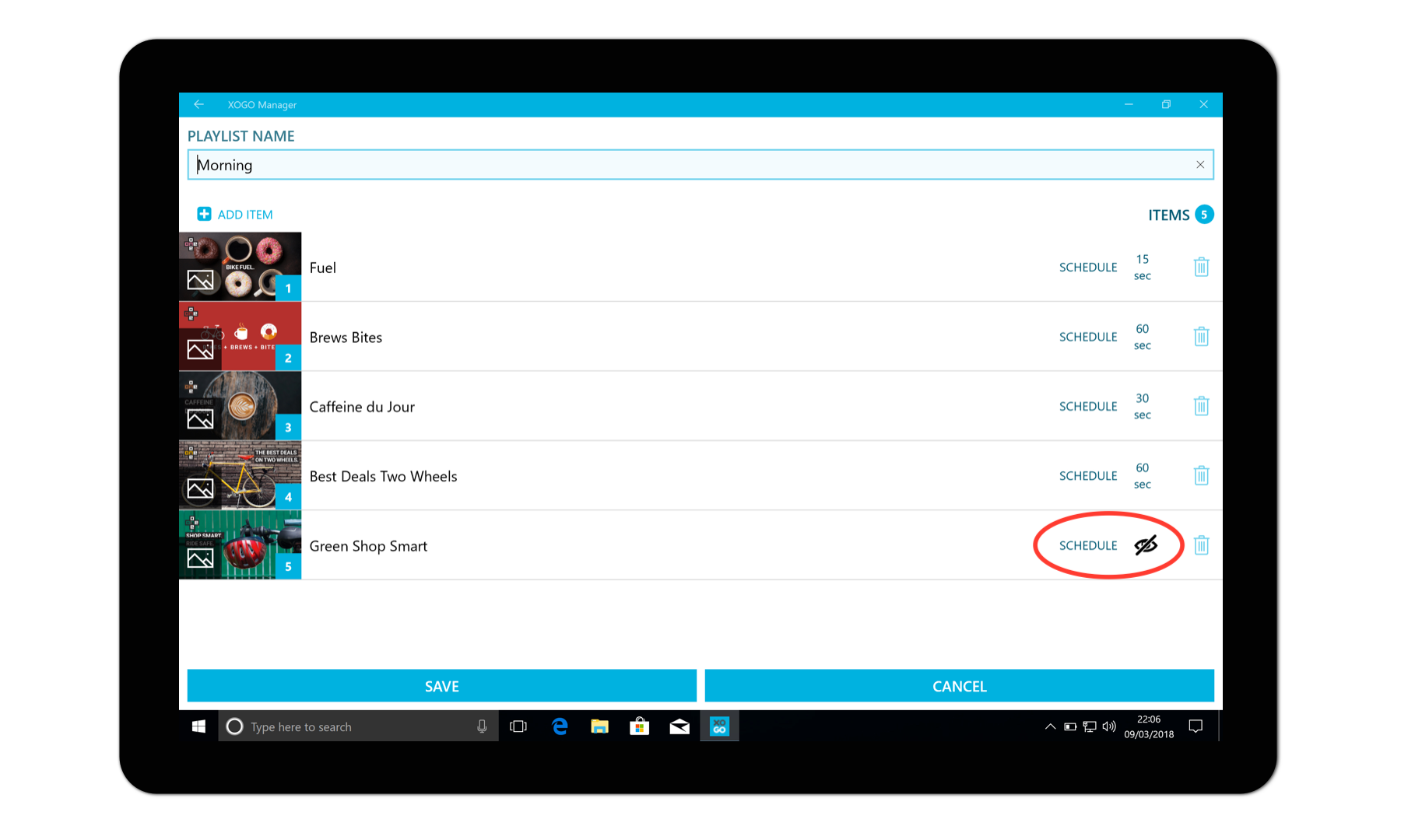 Tap +NEW in the playlist section. Give your playlist a name and click +ADD ITEM to select from the media files that you uploaded to your library. Click SCHEDULE if you’d like to choose specific days/times when each item will play, or click to adjust how long each individual graphic will play (videos always play in their entirety).