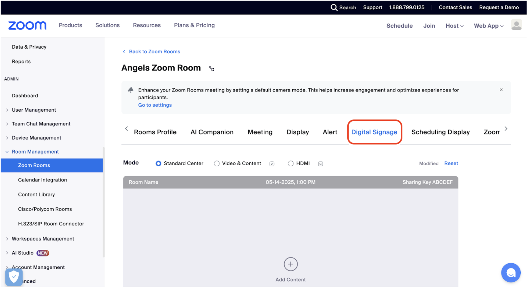 d) Select the Digital Signage tab and then click the +Add Content icon.
